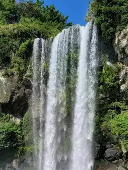 The water cascades down from a high cliff with unstoppable force—that's Cheonjiyeon Waterfall. The stream of water, pouring down like white threads, swiftly flows into the deep pond below, creating an overwhelming presence that feels as if it's falling straight from the sky. The waterfall changes its appearance with each season. In summer, it contrasts beautifully with the lush green forest, adding a refreshing vibe, while in autumn, the water stream appears softer as it flows amidst the red and yellow leaves.