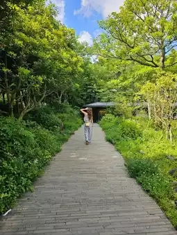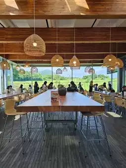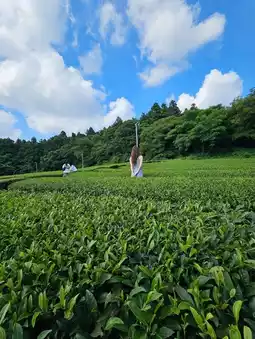 A vast green tea field spreads outside the premises, making it a popular spot for taking photos and strolling. There is also an observation area where you can see the mountain scenery over the tea fields.