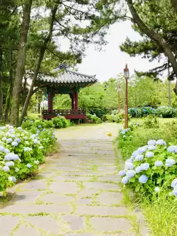 Honinji Wedding Site on Jeju Island is a profoundly significant historical and cultural landmark, revered as the legendary birthplace of Jeju's founding. This sacred site, believed to be where the three mythical founding ancestors married, offers a tangible connection to the island's ancient myths and traditions. During the blooming season, the grounds are beautifully adorned with vibrant hydrangeas, adding a colorful, almost magical layer to the ancient legend. The sight of these lush blooms amidst the historical setting enhances the mystical atmosphere, allowing you to walk on grounds steeped in history and vibrant natural beauty. It’s an essential stop for anyone interested in Jeju's unique heritage and foundational legends, made even more picturesque by the seasonal flowers.
