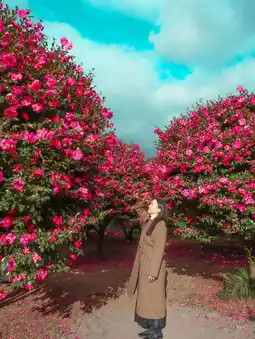 Tip: Wear neutral or contrasting colors (like white, green, or black) to make the vibrant red camellias pop in your photos.