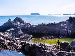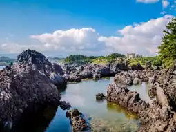 Located at the foot of Sanbangsan Mountain, Socheonji Pond boasts a unique landscape combining natural lava formations with the ocean. The pools created by crashing waves resemble small ponds, hence its name. The deep blue color of the water, combined with the surrounding rocks, creates a mystical atmosphere. Stroll along the coastal path and marvel at the harmonious landscape created by nature. It's a perfect place for a quiet retreat and photo opportunities.