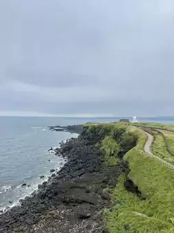 Walking along the path next to the calm sea, you can catch a glimpse of the lighthouse and Seongsan Ilchulbong Peak in the distance. The slight breeze was so refreshing. 🍃 The gentle slope made for an easy walk, and the occasional horse sighting made the trip even more romantic. 🐴 It's Jeju's signature healing course, perfect for a leisurely stroll overlooking the ocean!