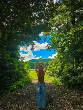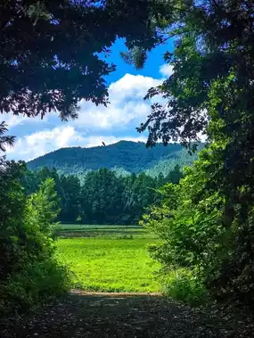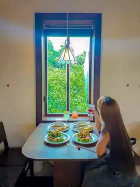 The photo zone of Songdangmukkunmoru, a lush green field visible through the trees, is the best, creating a fairytale-like atmosphere.🌿