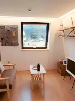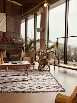 For those seeking more structured luxury, the Loft Lodge in AroundFollie is an architectural masterpiece. Inspired by traditional Jeju structures, the unique spatial design features a connected, winding staircase linking the living room, kitchen, bedroom, and the signature open-air bathtub on the highest level. The high ceilings and large windows maximize the surrounding views of Nasiri Oreum, flooding the room with beautiful natural light. The feeling of soaking in the bathtub while looking out at the vast Jeju scenery is incredibly luxurious and private, making it the perfect romantic or restorative retreat.