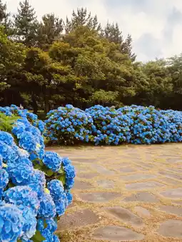 More than just a beautiful garden, Honinji bursts into life with vibrant blue hydrangeas, creating a breathtaking scene that connects visitors to Jeju’s foundational history. Amidst the flourishing blooms, the central pond and the three nearby basalt caves—traditionally known as the bridal homes of the three mythical couples—offer a deeper cultural experience. Stroll through the hydrangea-lined paths and take the time to read the plaques or admire the folk-art murals behind the community hall, which detail the legend of the Samsinin and the princesses. This lush setting transforms a simple nature walk into a meaningful journey, tracing the origins of the Tamna kingdom. It's a compulsory stop for history lovers and those keen to understand the island’s unique identity amidst a sea of blue blossoms.