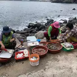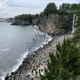 Jeongbang Falls, Jeju Island. Catch this stunning waterfall - the only one in Asia where the water flows direct into the sea! Catch Hyanyeos (the women divers of Jeju) selling their catch there too! #jeju #waterfall