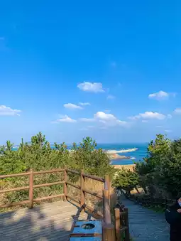 The blue sea that I saw here and there was so pretty, and the place where I could only see green trees was so pretty! The higher I went, the more I could see the whole Jeju Island at a glance, which was so cool and nice.