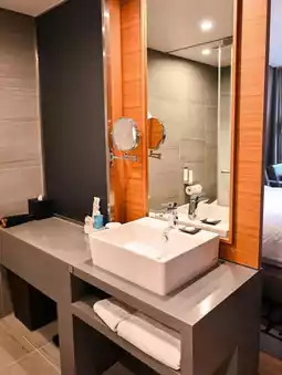 When you enter the room, there is a spacious washroom, and then behind that, there is a big boom! There's a big bed,
