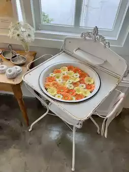 Introducing Marche Mua, a cafe in Samcheong-dong, Seoul that is currently garnering attention. This cafe has just opened, but it is already attracting attention. The interior is decorated in a European antique style, making it a very stylish cafe. There is a shop selling accessories on the basement floor, and the cafe is on the second floor. The specialty of this cafe is the cute fresh flowers on the sink next to the counter. 🌼
