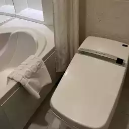The bathroom has a bathtub, and the toilet is equipped with a heated seat and washlet. Shampoo and body soap are provided. You will need to bring your own toothbrush.