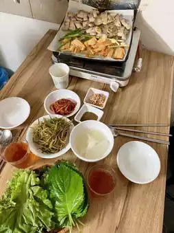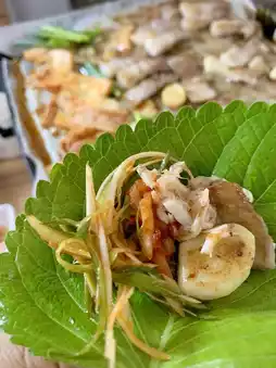 Place the meat on lettuce and perilla seeds, top with shrimp, kimchi, and garlic, and take a bite