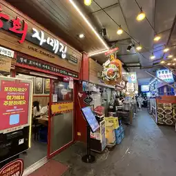 There are multiple Yukhoe Chamechi stores in the market. If you go to this store, which is the first store, you may be guided to a sister store. It's a popular store, so be prepared for a wait. Waiting times are usually around 20 to 30 minutes.