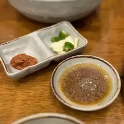 The raw liver has a firm texture and no odor, and is cut thickly with a slight sweetness. The chopped omamai has a crunchy texture. The dipping sauce, made with sesame oil, salt, and pepper, is delicious.