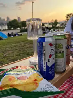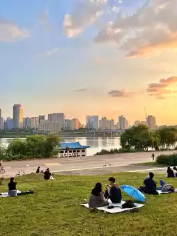 ☑️ Pass the Ttukseom Hangang Park entrance and turn right to find a spacious lawn! This is the perfect picnic spot👍🏻 You can even see the subway passing by, which adds a touch of sentimentality. It's also close to a convenience store, and the view of the Han River is beautiful, especially at sunset☺️❤️
