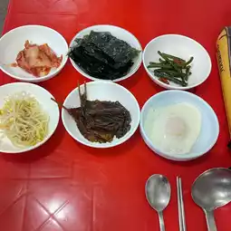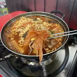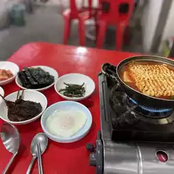 Drink the soup while it's boiling, eat the rice with the banchan, and pour the ramen over it - that's the Korean style.