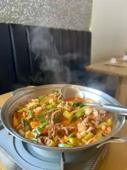 A colorful bibimbap with plenty of vegetables. I chose a fried egg topping. It's nice that you can adjust the spiciness to your liking.