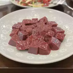 The liver eaten with sesame oil and salt has a firm texture without any fishy smell, a rich flavor and richness, and a thick and smooth texture.