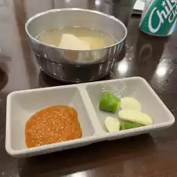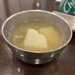 In Korean food culture, banchan is a free side dish served before the ordered food. This one has a mild-tasting soup with chunky radish, garlic, green chili peppers, and ssamjang.