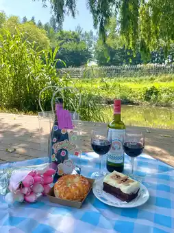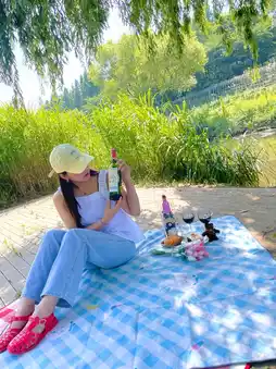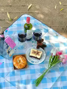 The picnic set includes a portable wine glass, chilling bag, a bouquet of artificial tulips, a picnic mat, and wine label stickers that are good for decorating the chilling bag, so I can decorate it cutely to my taste and take the wine and have a picnic in front of my house. It's so cute ~~~~~~~ 🕊️🫧🤍