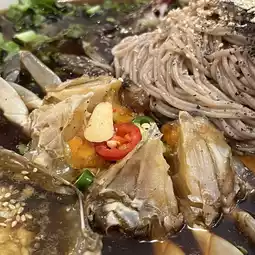 Ganjang Gejang is made by marinating fresh raw blue crab in soy sauce and aging it. The meat is sweet without any fishy smell, and the orange eggs and crab miso are appealing.