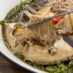 Here, soba noodles are served with the shell, and sauce and eggs are put into the shell to use as a dipping sauce. The soba noodles are delicious when enjoyed with the rich yet refreshing sauce.