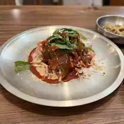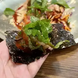 The hoe (sashimi) salad is also a part of the banchan. It is recommended to eat it wrapped in seaweed. It is a fresh hoe with a good texture.