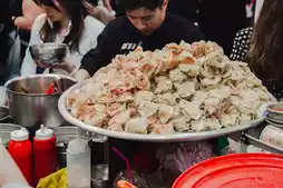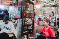 When you get to Gwangjang Market, it's not hard to find the auntie's shop because there's a long line of people waiting. There's a clear Netflix sign on the pole.