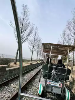 Trip ~ 7:20 departure Rail bike Cold weather with the sun Ride very comfortable on the boat feeding seagulls (did not take pictures but the third picture still not finished eating shrimp taste first😂) end of the month park is very spacious beautiful good place to take pictures Songyuedong fairy tale village Chinatown eat fried noodles Jianghua seaside resort play slope slide super praise praise praise fun ~ about 18:40 back