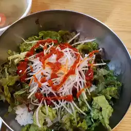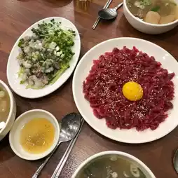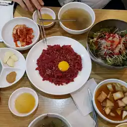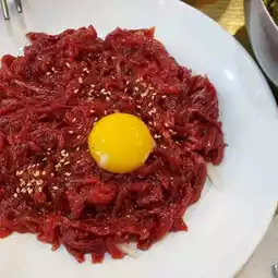 Korean bibimbap sauce mixed with raw beef and vegetables