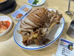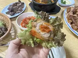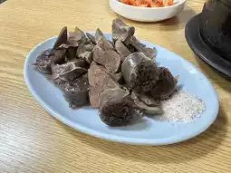 Because we were the first group of guests, the aunt greeted us warmly and helped us order. As soon as she found out that we were from Taiwan, she immediately pointed up and asked me to watch it. It turned out that she had visited a Taiwanese food program and the host was Guo Jing. Oh my god. It must have been too long ago😆. After a while, the dishes were served. I felt full just when I was taking pictures. I had done my homework and knew that ordering pig's feet would come with side dishes, soup and blood sausage, but I didn't expect it. That’s a lot of portions! ! But in addition to the spicy and salty miso soup, the pig's trotters + kimchi and lettuce really go together well. You won't feel tired after eating several in a row. The pig's trotters themselves are also very tender and delicious. The blood sausage is not what I imagined sausages to be. The taste is a bit soft and glutinous, but it goes very well with the rose salt on the side. I almost finished the meal without realizing it. In the end, the aunt kept saying service and invited us to drink rice wine. It was really kind and cute☺️