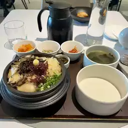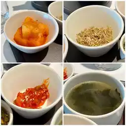 Chinese cabbage kimchi, stir-fried dried baby sardines and pumpkin seeds, salted squid with green chili peppers, and wakame miso soup are also served as banchan.