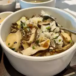 Kamameshi topped with abalone, white wood ear mushrooms, shiitake mushrooms, green onions, nori seaweed, hijiki seaweed, and ginkgo nuts.