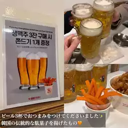 When I ordered three beers, I was also given snacks of fried and seasoned Korean traditional snacks✨