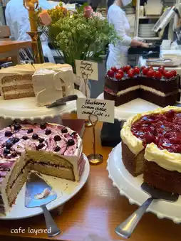 A photogenic cafe with colorful cakes and scones lined up in a European-style interior 🍰