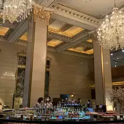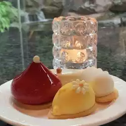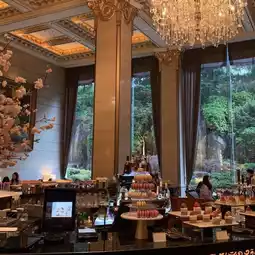 I'm really happy when I enjoy sweet afternoon tea next to the glass wall with the waterfall falling down💞