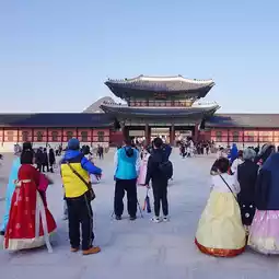 Upon entering Gyeongbokgung Palace, I saw a group of tourists dressed in traditional hanbok, making it feel like a journey back to the Joseon era