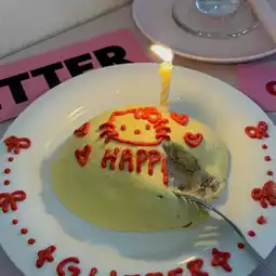 Recommended menu Banana Pudding🍌 7500 won The banana pudding that looks like omurice has Hello Kitty drawn on it, so cute It comes with a candle, so you can light the candle at your own pace