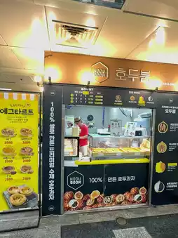 While traveling by train from Dongdaemun, I came across a hodukaja (walnut bun) specialty store called "HODU BOOM🇰🇷