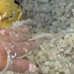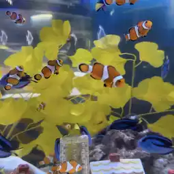 The names of the fish written in front of the tanks are written in Japanese. ♡