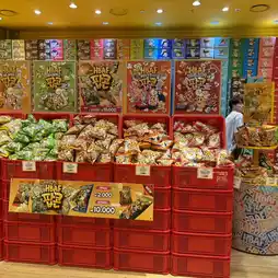 HBAF's best-selling product is the butter and honey flavored almonds. The flagship store in Myeongdong sells not only the best-selling almonds, but also peanuts, popcorn, potato chips, sweet wine, and more.