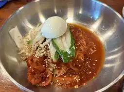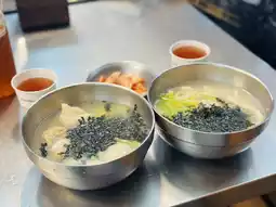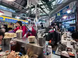 One of the famous stalls in this market is the Grandma's Netflix stall, which sells Korean dumpling noodles. There's also a well-known stall selling stuffed pork with sweet peppers and cinnamon-sprinkled fried dough.