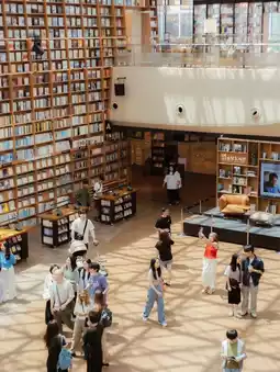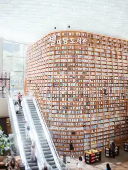 The open-ceiling structure and the huge bookshelves that reach up to the ceiling are a sight to behold𓂃