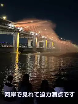 April-June, September-October 12:00, 19:30, 20:00, 20:30, 21:00July-August 12:00, 19:30, 20:00, 20:30, 21:00, 21:30I arrived at the square after 20:00 (after sunset), so I was impressed by the beautiful view of the fountain shining in rainbows to the music🌈There were a lot of people under the bridge, as you can see the view from behind the fountain from the sidewalk under the bridge. It was Sunday, so there were a lot of people and the walking route from Express Bus Terminal Station was full of people. It was a bit tough to walk for almost 20 minutes, but I'm really glad I got to see this fountain show 🌈 This show will be held until the end of October, then it will be held again from April next year 🌉