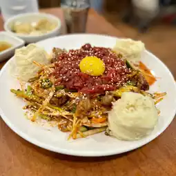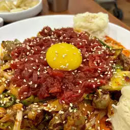 Mixing it with yukhoe mellows the sour and spicy flavor, and the umami of the raw meat and the richness of the egg yolk add to the depth of flavor.