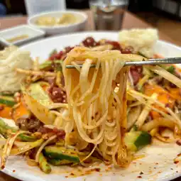 Mixing whelk and somen noodles is a standard menu item at Korean izakayas. Whelk, green onions, mitsuba, and other vegetables are tossed in a miso sauce called "chojang," characterized by its refreshingly sour and spicy flavor, resulting in an addictively appetizing spiciness.