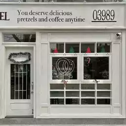 It has a white exterior and a stylish European feel 🏠 There is a pretzel painted on the window! When you enter the store, you will see many types of pretzels lined up❤️