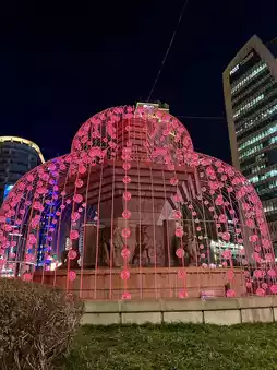 Every day, starting at 5:00 PM, Myeongdong's main streets are transformed into a Christmas wonderland. The dynamic music and light displays are truly moving. 🎅