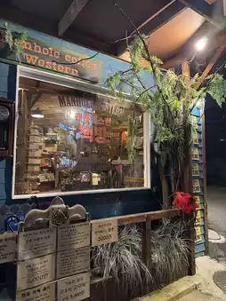 Inside the first floor of Manhole Coffee Western Bookstore, there is a large Christmas tree that exudes a festive Christmas atmosphere. The large tree is beautiful, and the interior of the bookstore is filled with a vintage vibe, making it a great place to take photos.