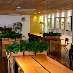The interior of the store is decorated with warm wooden furniture, antique-style interiors and lots of greenery, creating a relaxing atmosphere