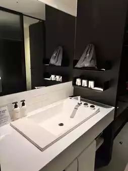 The washbasin is located across from the shower room, and the washbasin is open, so it is good for lightly washing your hands or putting on makeup.